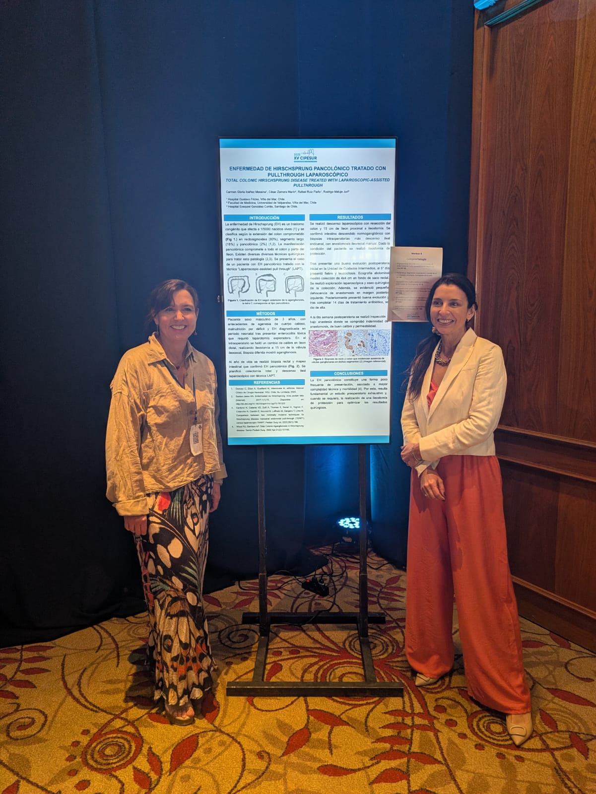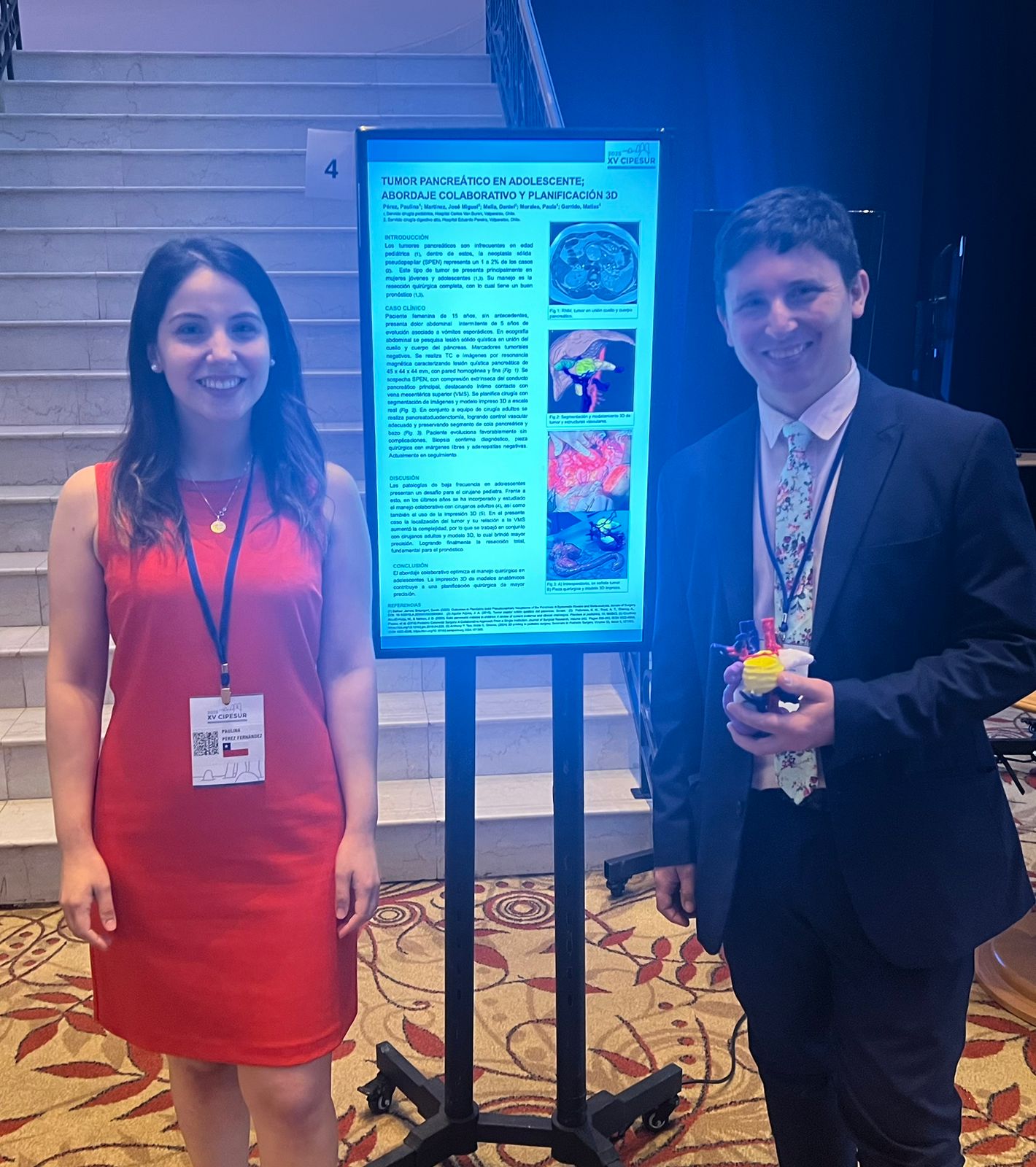 También se presentaron dos trabajos en modalidad póster vinculados a nuestra institución. El jueves 20 de noviembre, la residente Dra. Paulina Pérez presentó "Tumor Pancreático en Adolescente: Abordaje Colaborativo e Impresión 3D", el cual acompañó con la exhibición del modelo impreso en 3D que fue utilizado durante la planificación quirúrgica del caso expuesto. Por su parte, el viernes 21 de noviembre fue el turno de nuestra colaboradora, la Dra. Carmen Gloria Ibáñez, del Hospital Dr. Gustavo Fricke, presentó "Enfermedad de Hirschsprung Pancolónica tratada con Pull-Through Laparoscópico". Este trabajo contó con la participación del interno de Medicina UV, César Zamora.